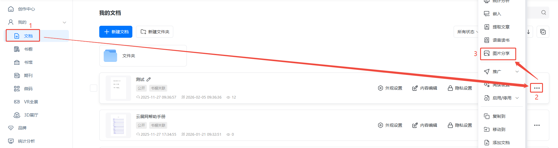 點擊【文檔】,然后點擊對應(yīng)電子書的右邊三個點,然后點擊【圖片分享】。