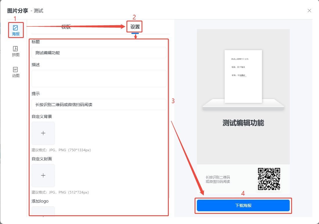 b)點擊【海報】,然后點擊【設(shè)置】,下方輸入海報信息,最后點擊右側(cè)【下載海報】即可下載下來。