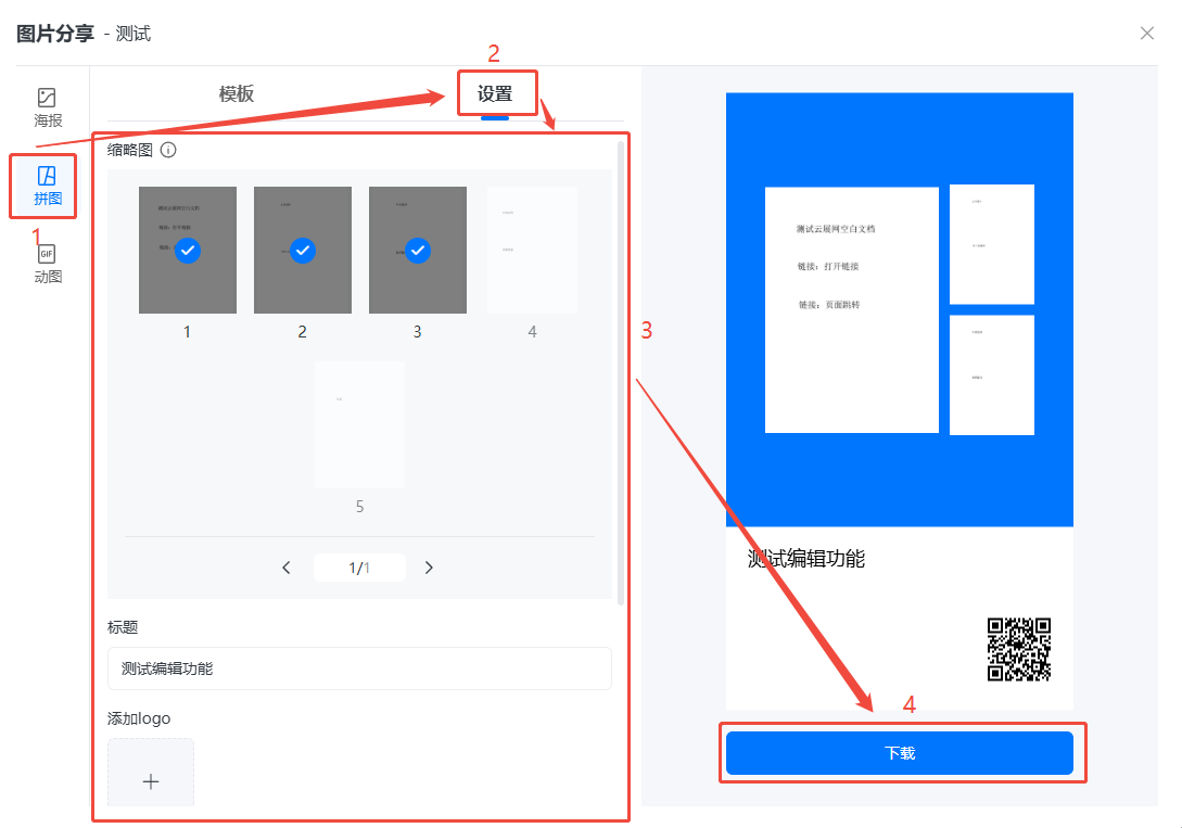 b)點擊【拼圖】,然后點擊【設(shè)置】,下方選擇要出現(xiàn)在海報上的頁面縮略圖,以及輸入海報信息,最后點擊右側(cè)【下載】即可下載下來。