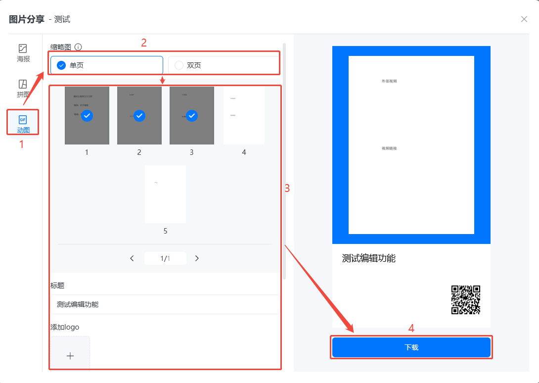 點擊【動圖】,選擇縮略圖要單頁顯示還是雙頁顯示,然后選擇要出現(xiàn)在海報上的頁面縮略圖,以及輸入海報信息,最后點擊右側(cè)【下載】即可下載下來。