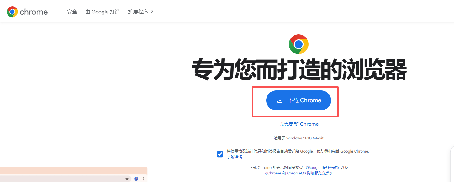 前往谷歌瀏覽器官網(wǎng),點(diǎn)擊【下載Chrome】下載,網(wǎng)站會(huì)自動(dòng)檢測(cè)并下載安裝程序,下載好后安裝使用。
