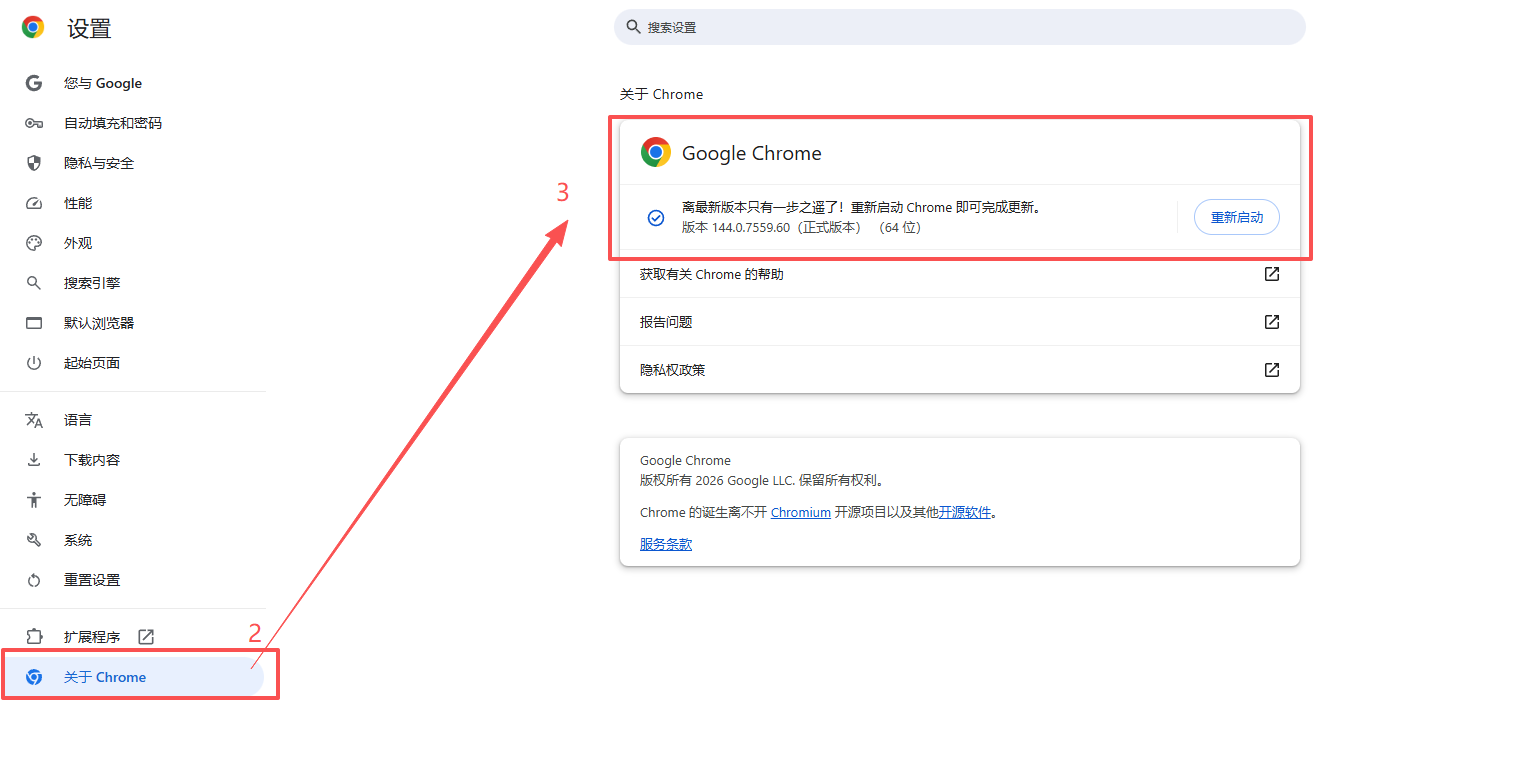 點(diǎn)擊右上角三個(gè)點(diǎn)圖標(biāo)?,點(diǎn)擊【設(shè)置】,在關(guān)于 Chrome頁(yè)面將自動(dòng)加載,頂部顯示當(dāng)前版本號(hào)(如“版本 144.0.7559.60(正式版本) (64 位)”),若顯示“已是最新版本”或類似提示,表明當(dāng)前為最新版本。??若提示“重新啟動(dòng)即可更新”或“有新版 Chrome 可用”,則需更新。