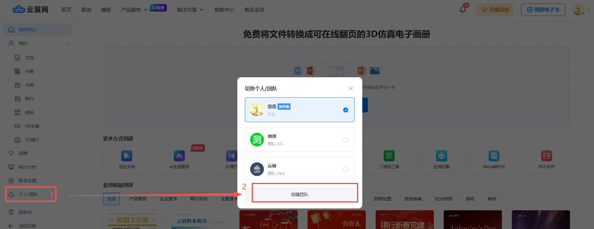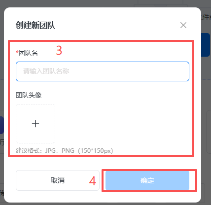 點擊【個人/團隊】打開,點擊【創(chuàng)建團隊】,輸入團隊名以及上傳團隊頭像后點擊【確定】,即為創(chuàng)建成功。