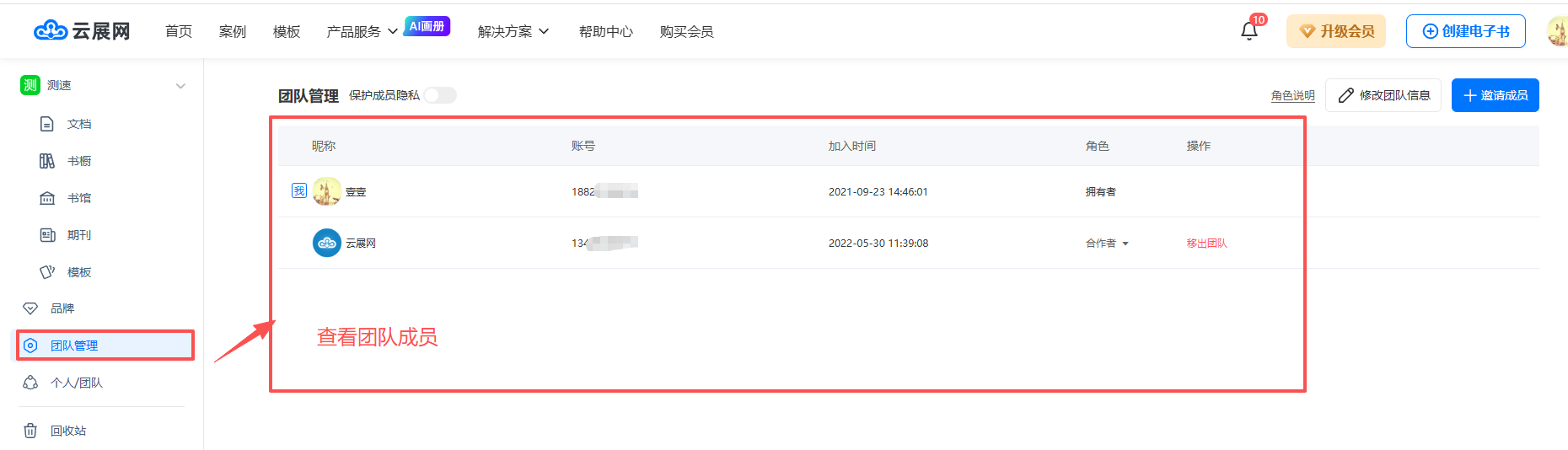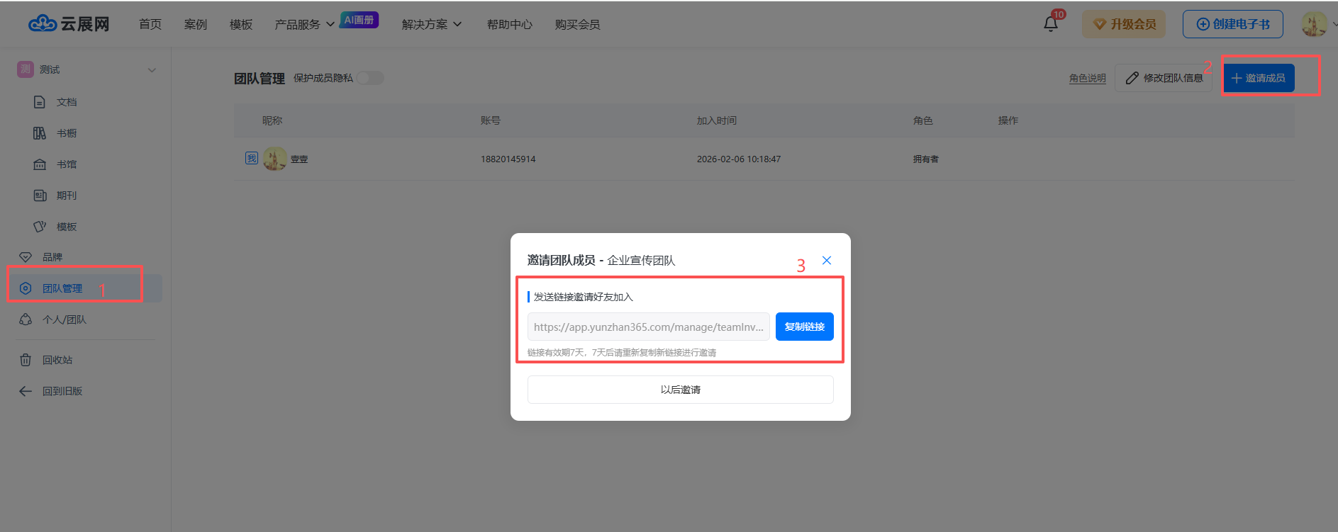 點擊【團隊管理】,點擊右上角的【邀請成員】按鈕,會有一個邀請鏈接,復(fù)制后發(fā)給好友,好友點擊鏈接進去即可申請加入團隊。