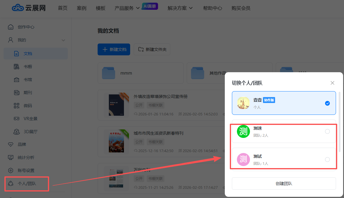 點擊【個人/團隊】,點擊已創(chuàng)建好的團隊打開。