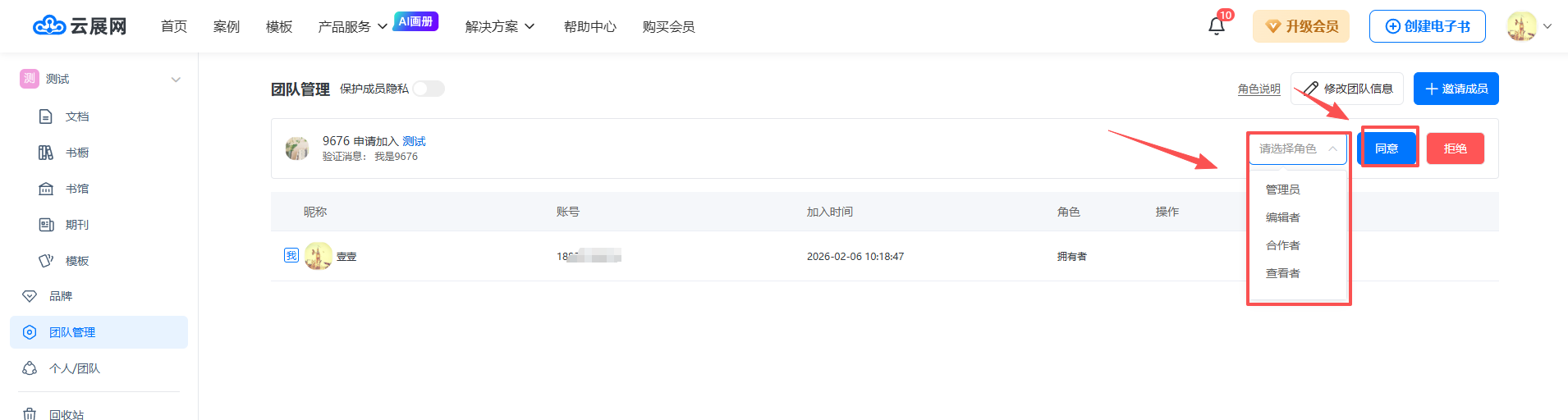 當(dāng)被邀請人同意加入團隊時,頁面會彈出申請消息。主賬號需同意被邀請人加入,并為其分配角色。不同的角色有不同的權(quán)限,共有五個角色,其中主賬號為擁有者,協(xié)作子賬號有四種角色:管理者、編輯者、查看者和合作者。每個角色具體的差別請看教程:《角色權(quán)限說明》。
