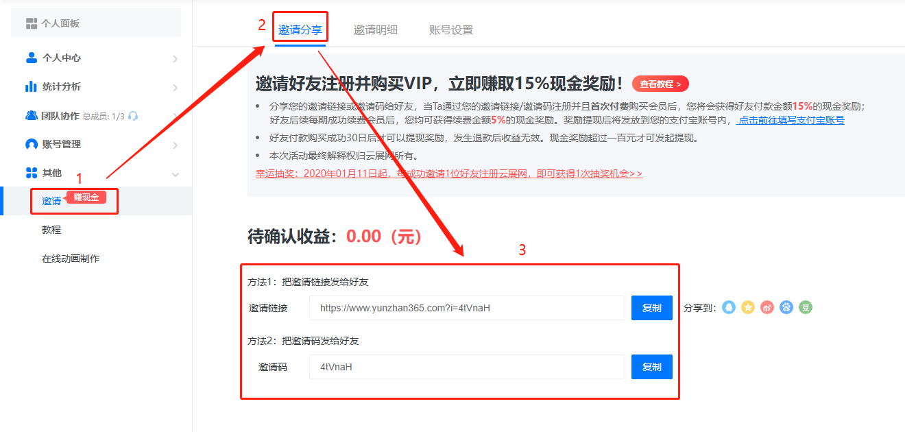 把邀請鏈接或者邀請碼發(fā)給需要購買會員的人注冊云展網(wǎng)賬號,讓他在注冊的時候務(wù)必填寫您的邀請碼,或者打開您的邀請鏈接注冊。