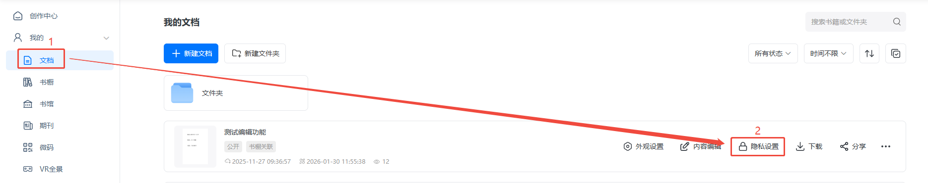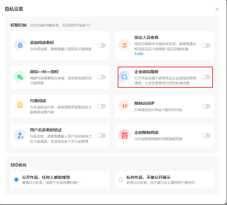 點進【文檔】,找到你需要設(shè)置企業(yè)微信吸粉的電子書,點擊【隱私設(shè)置】,勾選【企業(yè)微信吸粉】。