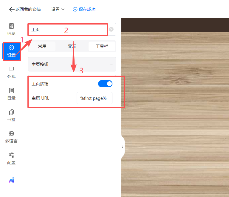 點擊【設(shè)置】,在搜索欄中搜索“主頁”,開啟【主頁按鈕】,然后設(shè)置【主頁URL】。默認情況下,將跳轉(zhuǎn)至電子書首頁;若需跳轉(zhuǎn)至外鏈,可輸入外鏈鏈接。