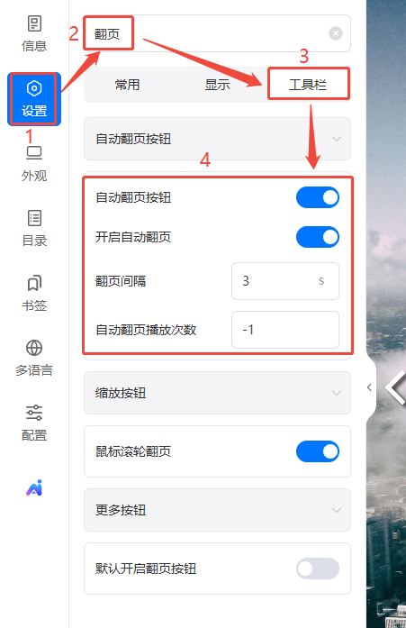 點(diǎn)擊【設(shè)置】,上方搜索【翻頁(yè)】,然后點(diǎn)擊【工具欄】,將【自動(dòng)翻頁(yè)按鈕】和【開(kāi)啟自動(dòng)翻頁(yè)】都打開(kāi),最后再設(shè)置【翻頁(yè)間隔】和【自動(dòng)翻頁(yè)播放次數(shù)】即可自動(dòng)保存。