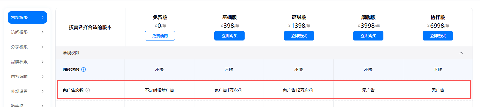 付費(fèi)會(huì)員有效期內(nèi),只要有充足的免廣告次數(shù)即可自動(dòng)去除書本上的廣告,基礎(chǔ)版會(huì)員每年贈(zèng)送1w次免廣告次數(shù),高級(jí)版會(huì)員每年贈(zèng)送12w次免廣告次數(shù),旗艦版和協(xié)作版則是每年無(wú)限免廣告次數(shù)。