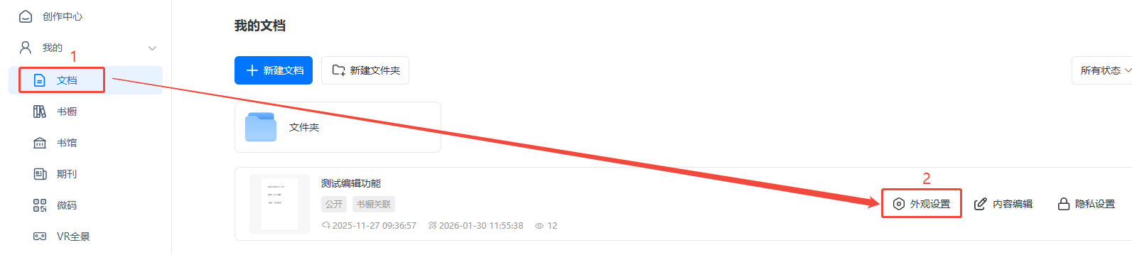點擊【文檔】,找到對應(yīng)電子畫冊,然后點擊【外觀設(shè)置】。
