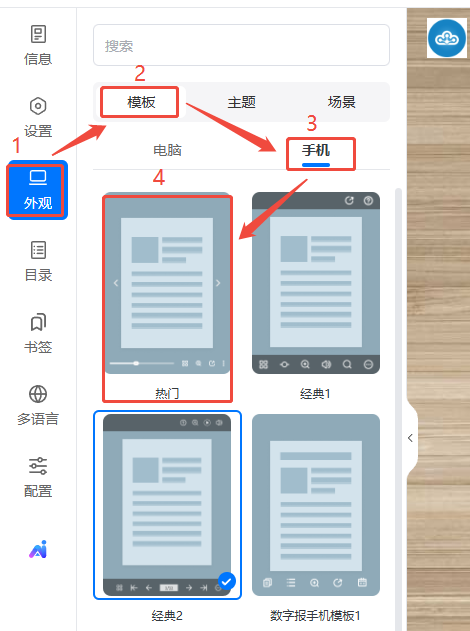 點擊【外觀】,再點擊【模板】,最后點擊【手機】,選擇【熱門】模板。