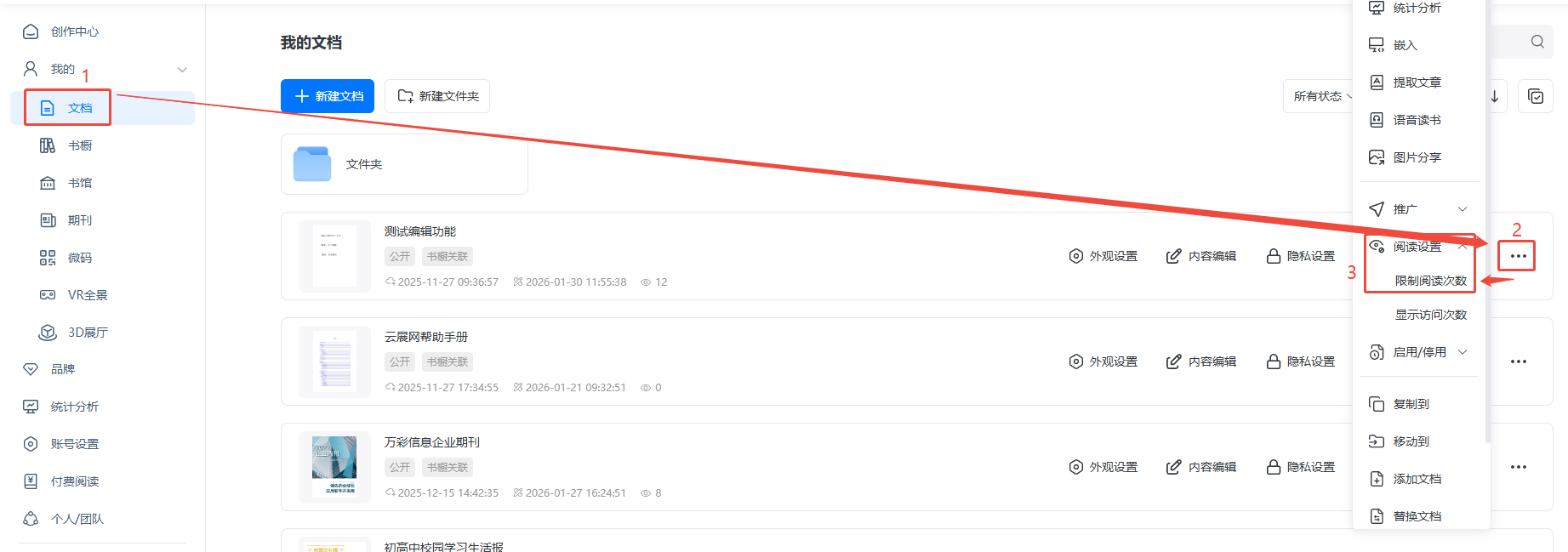 點(diǎn)進(jìn)【文檔】,找到需要設(shè)置閱讀次數(shù)限制的畫冊,點(diǎn)擊【…】選擇【閱讀設(shè)置】,然后點(diǎn)擊【限制閱讀次數(shù)】。