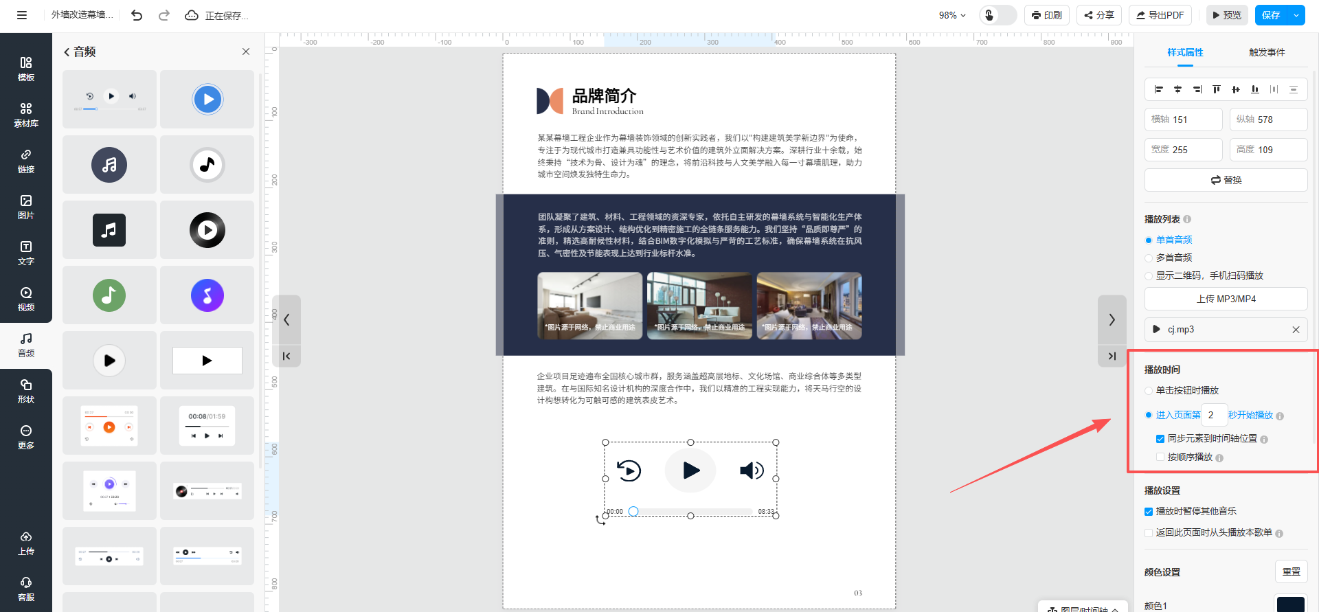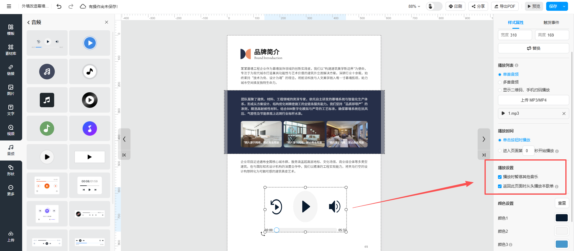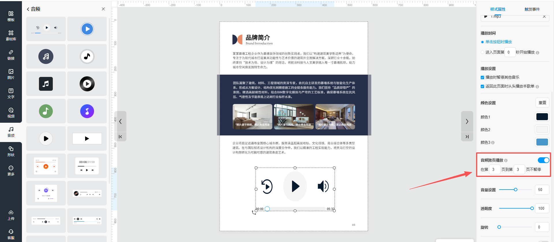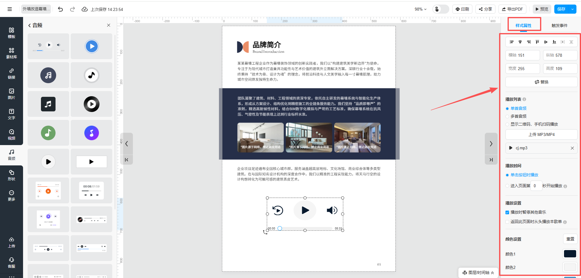 根據(jù)你的需求,在屬性面板中你可以上傳音樂,設(shè)置音樂播放方式,自定義音樂控件的顏色、陰影、位置大小以及旋轉(zhuǎn)。