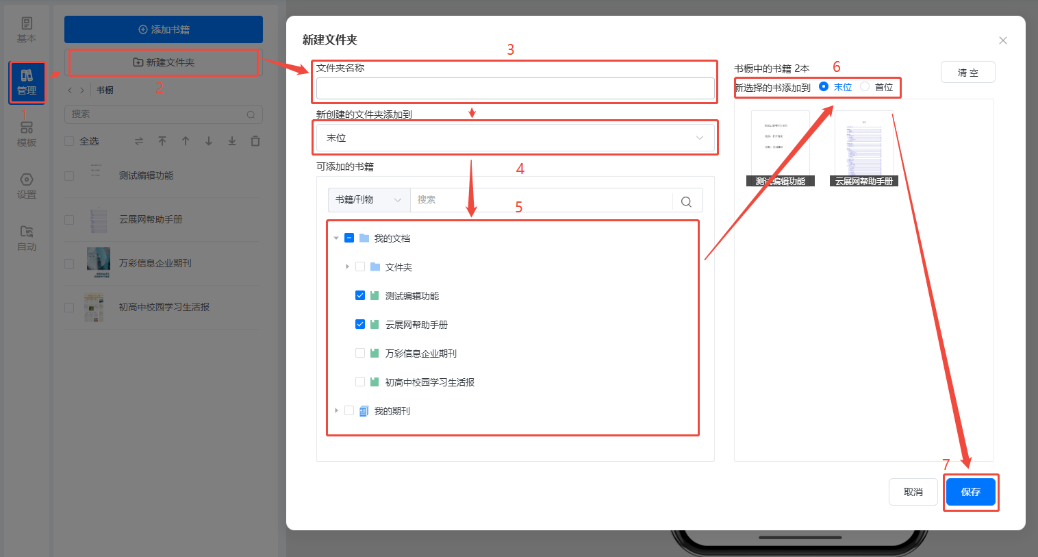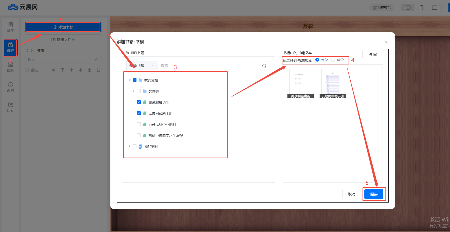 點(diǎn)擊【管理】,再點(diǎn)擊【添加書籍】,勾選需要添加的書籍,選擇新選擇的書本要添加到末位還是首位,最后點(diǎn)擊【保存】。