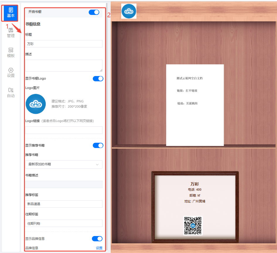 設(shè)置書櫥的基本信息,包括標(biāo)題、描述、LOGO、推薦書籍、品牌信息等。